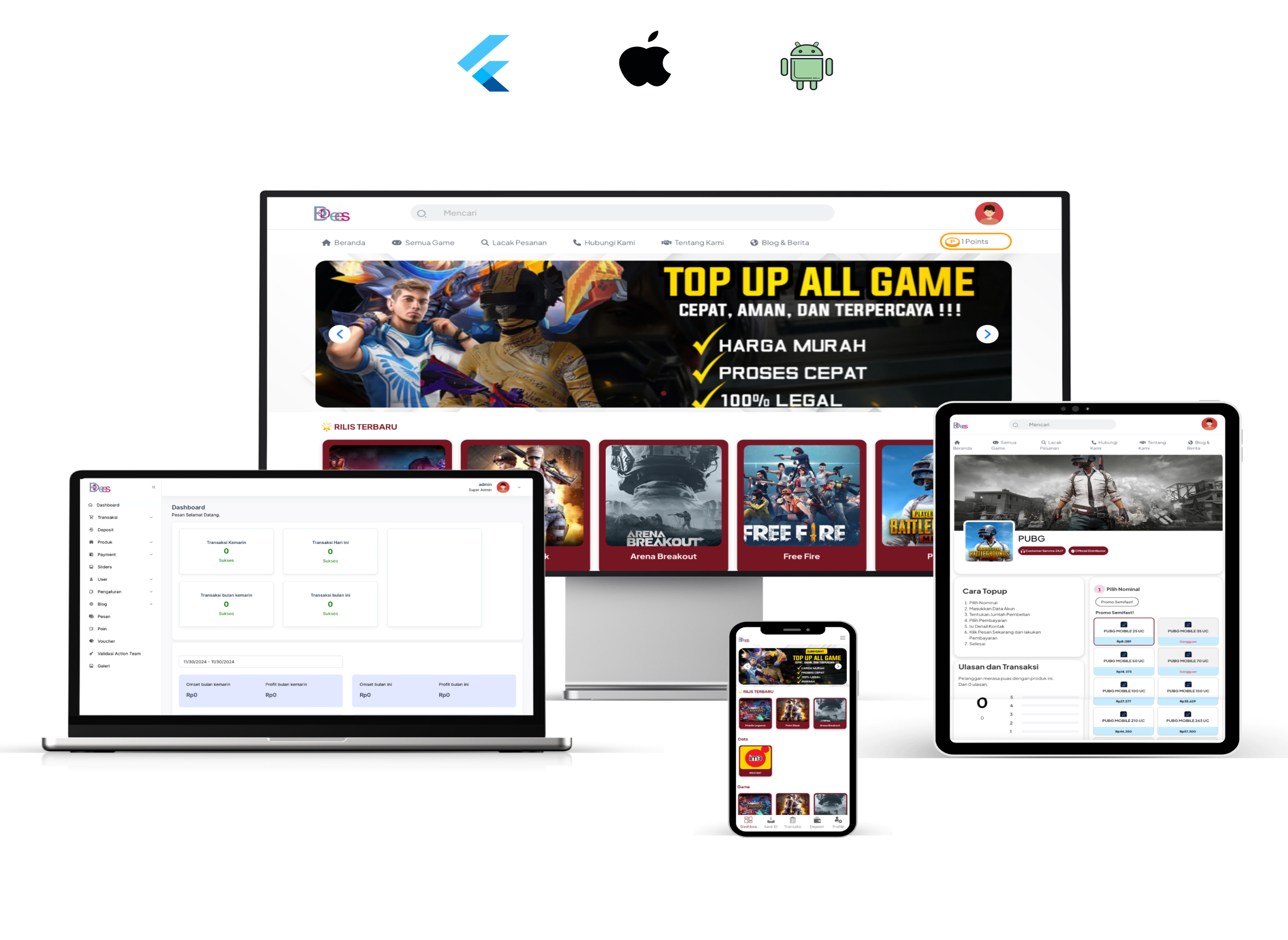 Paket Website dan Aplikasi TopUp Game Biasa, SIAP PAKAI dengan full akses, untuk custom design dan fitur silahkan hubungi admin, proses pembuatan cukup mudah, tinggal input domain yang mau di beli dan Logo brand kamu sendiri, Aplikasi siap di publish